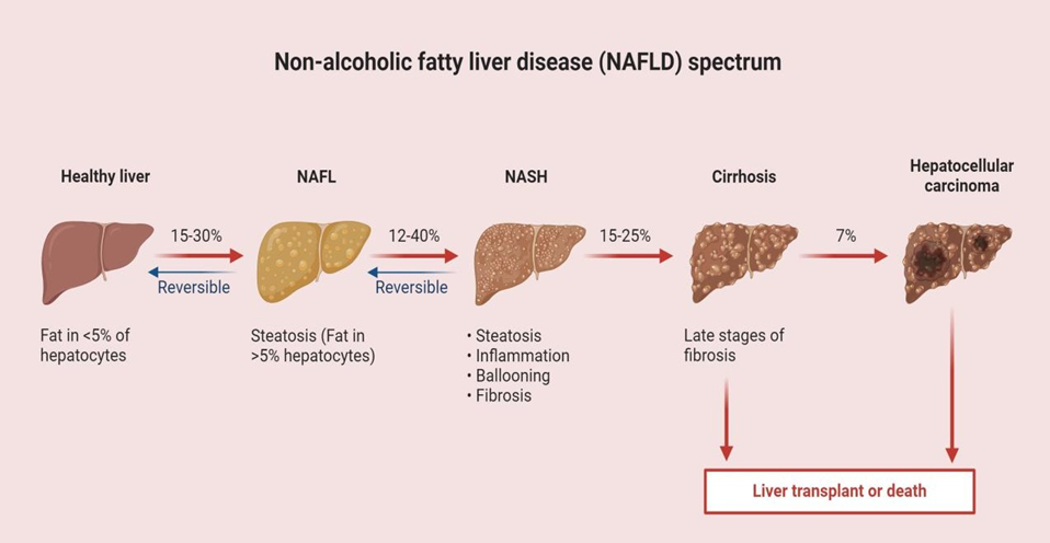The condition termed NAFLD is characterized by fat accumulation liver. It affects people who consume no or less alcohol. This condition is characterized by inflammation and excessive fat accumulation. It is significantly correlated with obesity and metabolic disorder. People at risk for NAFLD may develop cirrhosis, liver carcinoma, and heart problems. The incidence of NAFLD is shown to be between 20% and 30%, with a higher prevalence in elderly populations, and there are approximately 2 new cases per 100 patients each year. (1) . Macro vesicular steatosis presence in ≥5% of hepatocytes in individuals that consume less/no alcohol described as NAFLD. Classification of NAFLD (non-alcoholic fatty liver), which also called as simple steatosis, NON-ALCOHOLIC STEATOHEPATITIS is an advance form of NAFLD which can further develop into cirrhosis of the liver, hepatocellular carcinoma (2). Individuals with NAFLD often experience obesity or diabetes, with insulin resistance contributing as significant pathogenic factor. There are four distinct phenotypes identified among patients with NAFLD,