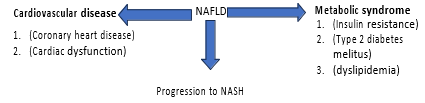 The activation of caspase-1 through the NLRP3 inflammasome results in the proteolytic activation of proinflammatory cytokines from the IL-1β family, leading to the activation of the inflammatory cascade from IL-1 to IL-6 to C-reactive protein (CRP). This pathway plays a crucial role in the onset of vascular inflammation and the progression of atherosclerotic cardiovascular disease.. (10)All evidence described above suggest that individuals suffering from NAFLD may devolop disease like hypertension ,cardiac arrythmia , cardiac artery disease (10) .