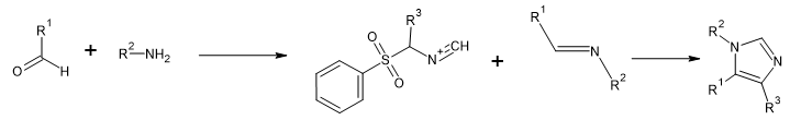 The Van Leusen imidazole synthesis is a highly adaptable method for producing imidazole derivatives, utilizing the reaction between tosylmethyl isocyanides (TosMICs), aldehydes, and primary amines. In this process, TosMIC serves as a crucial building block that enables the efficient construction of the imidazole ring. The mechanism involves a nucleophilic addition of the aldehyde to TosMIC, followed by condensation with a primary amine, ultimately leading to cyclization and formation of the imidazole core. ( Scheme-3) This strategy is especially valuable in medicinal chemistry, as it allows for the incorporation of diverse substituents, facilitating the synthesis of structurally varied and potentially bioactive imidazole analogs (Scheme-3).