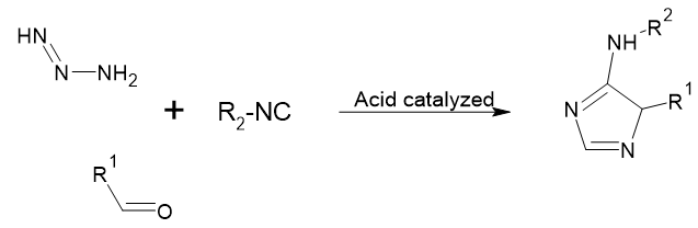 The Groebke-Blackburn-Bienaymé (GBB) synthesis is a powerful and efficient multicomponent reaction that facilitates the construction of imidazole derivatives through the condensation of an aldehyde, an isocyanide, and an amidine. Conducted as a one-pot reaction, the process begins with the formation of an intermediate between the aldehyde and isocyanide, which then reacts with the amidine to yield a variety of substituted imidazoles. This method is especially prized in synthetic organic chemistry for its simplicity, atom economy, and ability to produce structurally diverse imidazole frameworks in a single step. The resulting compounds have widespread relevance in pharmaceutical development and materials science, underscoring the broad utility of the GBB approach in generating bioactive imidazole analogs. (See Scheme-4).