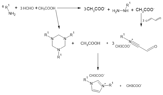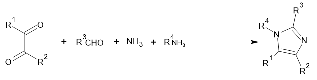 The first synthetic imidazole, known as glyoxaline, was prepared in 1858 by the German chemist Heinrich Debus. This classical synthetic route involves the condensation of a 1,2-dicarbonyl compound (such as glyoxal), ammonia or ammonium salts, and an aldehyde under either acidic or basic conditions. The reaction proceeds through the formation of a Schiff base, followed by cyclization and dehydrogenation, ultimately yielding imidazole rings. Owing to its straightforward procedure, broad applicability, and efficient synthesis of diverse imidazole derivatives, this method remains widely employed in medicinal chemistry. (Scheme-1)