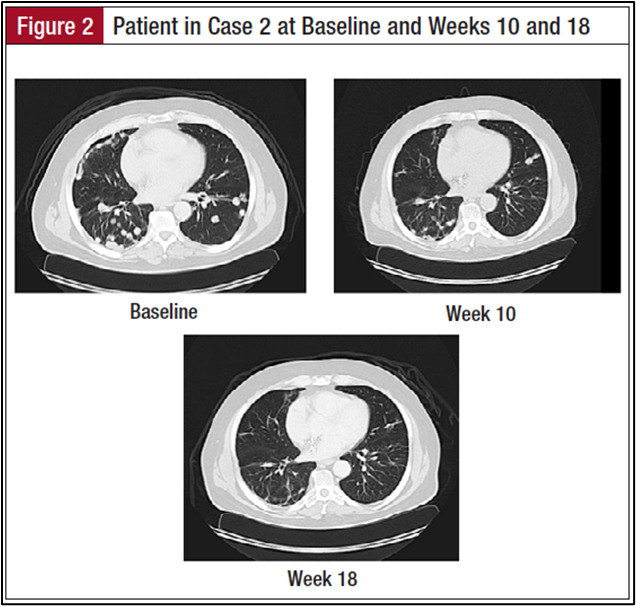 The patient began on the anti–PD-L1 antibody with his first infusion in December 2013. His first scans 6 weeks after enrolling into the study indicated evidence of stable disease with minimal shrinkage of his pulmonary lesions. Subsequent scans have shown a dramatic reduction in the size and burden of his pulmonary nodules. His pleural effusion has resolved. The patient has been tolerating the therapy well with no side effects. He is continuing to receive the anti–PD-L1 antibody every 2 weeks with continued evidence of tumorshrinkage9monthsafterenrollinginthestudy.[17]