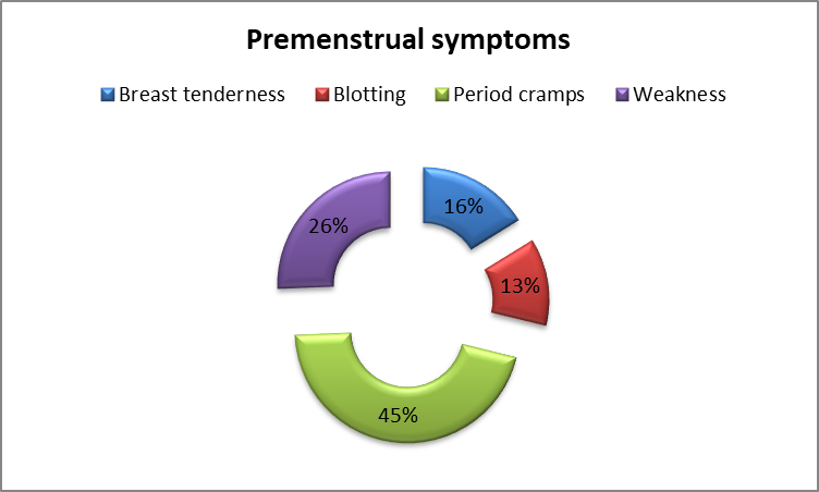 The graph shows the distribution of different premenstrual symptoms observed in the subjects. Among the subjects with premenstrual symptoms, 120(27.3%) of subjects have breast tenderness, 94(21.4%) have blotting, 338(77%) have period cramps and 190(43.3%) have weakness.