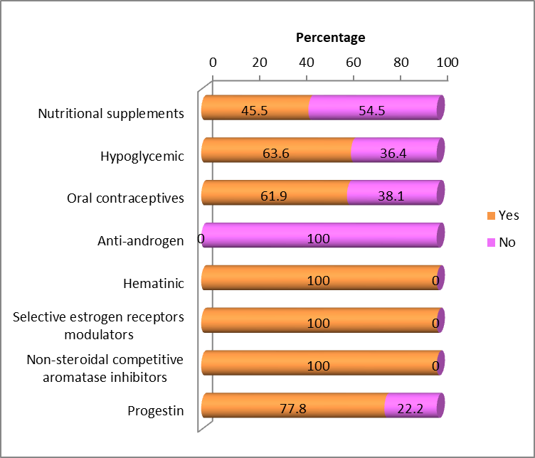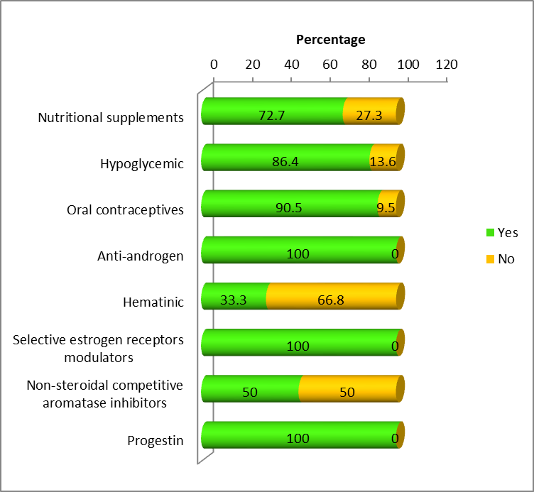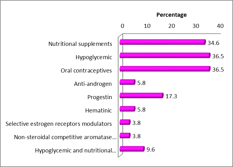 In this total subjects, 52 (17.4%) of subjects were taking medication for treating PCOS. Among the 52 subjects, 18(34.6%) were taking nutritional supplements, 19(36.65%) were taking hypoglycaemic medicines, 19(36.65%) were using oral contraceptives, 3(5.8%) were taking anti-androgen medicines, 3(5.8%) were taking hematinics, 2(3.8%) were taking selective estrogen receptors modulators, 2(3.8%) were taking non-steroidal competitive aromatase inhibitors and 5(9.6%) were taking both hypoglycaemic medications and nutritional supplements. The majority of PCOS patient in the study were treated with hypoglycaemic agents. The use of nutrition supplement suggest an effort to manage PCOS holistically.