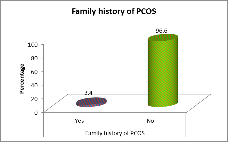 Subjects having family history of PCOS are more prone to develop PCOS. Among the total subjects, 18 (3.4%) of cases have family history of PCOS.