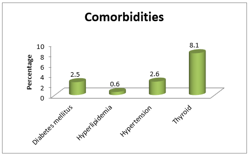 It was found that some comorbidities are leading to the development of PCOS other than the risk factors that are previously mentioned. It was observed that 12.5% were having these comorbidities such as diabetes (2.5%), hyperlipidemia (0.65%), hypertension (2.6%) and thyroid (8.1%).