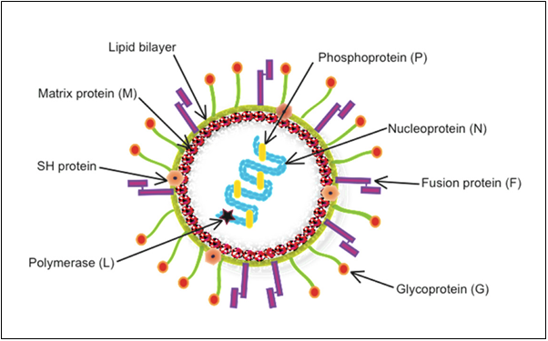 Figure 1:Human metapneumovirus (HMPV) structure (Depicts the model structure of human Metapneumovirus (hMPV) with labeled components.)(4)