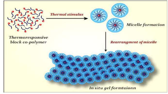 In this type of formulation, temperature is one of the most commonly employed triggers in polymer systems that respond to environmental changes. The use of temperature-sensitive methods is convenient and adaptable for applications in both laboratory (in vitro) and living systems (in vivo) conditions, body temperature triggers gelation: external heat is not required. When the liquid form (in room temperature) changes to a gel state (35-370C), this happens when the hydrogels come into contact with the body fluid and as a result of rise in the temperature.2