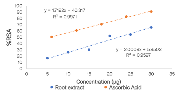 Table 2: Concentration and % RSA, IC50 value of ascorbic acid and root extract.