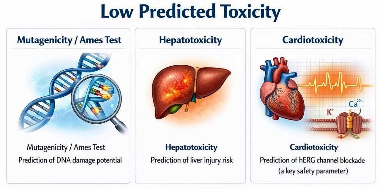Good oral Bioavailability, moderate-good solubility, low predicted toxicity |