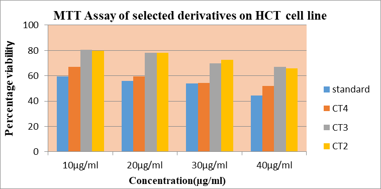 After the preliminary in-silico molecular modeling studies followed by the docking studies on the binding pocket of Human TOPO (II)A receptor, thiazoliino chromne derivatives were selected for wet lab synthesis. The synthesized compounds were purified and characterized by FT-IR, 1HNMR and Mass spectral studies. Docking studies proved that the CT2, CT4 and CT6 were more effectively bind with the receptor based on glide score. Four concentrations of the test compounds were used for MTT assay. The results were compared with that of standard drug 5-flurouracil. The concentrations used were 10,20,30 and 40 μg/mL.The cell lines used was HCT 116 cell line. Test results showed that the anticancer activity of the proposed derivatives is less than that of the standard drug 5-flurouracil. The compound CT4 shows more activity than CT6 and Cl (Table 8, Figure 3)