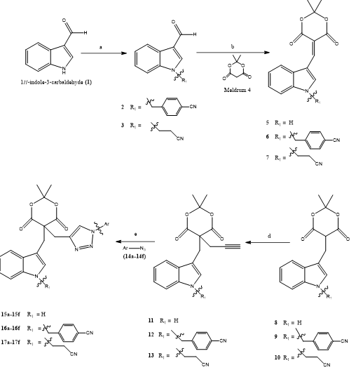 Satya Kumar et, al., A novel series of thirty-two 1H-indole-based Meldrum-adjoined 1H-1,2,3-triazole derivatives was synthesized and evaluated for their potential as dihydrofolate reductase (DHFR) inhibitors. This unique set of compounds (2–13, 15a–15f, 16a–16f, 17a–17f, 19a, 19b, and 20a) represents a new structural class of triazole-linked heterocycles. The derivatives labeled 15a–15f, 16a–16f, and 17a–17f were constructed via copper(I)-catalyzed azide-alkyne cycloaddition ("click" chemistry), involving substituted indole-based Meldrum alkynes (compounds 11, 12, and 13) and aromatic azides (14a–14f) in the presence of CuI and Hünig’s base. Further chemical modifications of these intermediates led to compounds 19 and 20, through the selective cleavage of the Meldrum acid moiety. The molecular structures of key intermediates—specifically compounds 6, 11, and 13—were unambiguously confirmed by single-crystal X-ray diffraction analysis. The full library was subjected to in vitro DHFR inhibition assays. Many of the synthesized molecules exhibited notable inhibitory activity, with IC?? values ranging from 3.48 ± 0.16 to 30.37 ± 1.20 μM. Among them, ten compounds—namely 15c–15f, 16c–16f, 17e, and 17f—stood out with particularly strong DHFR inhibition, while the remaining derivatives showed moderate efficacy. To further understand their binding interactions, molecular docking studies were conducted. Compound 16f displayed the most favorable docking score (−9.13 kcal/mol), suggesting high binding affinity with the DHFR active site, and outperforming compound 15c (moderate activity) and compound 16a (weaker activity). These computational results were in line with the observed biological activity data. Overall, this work introduces a new and promising class of DHFR inhibitors based on Meldrum–triazole–indole hybrids, which may serve as valuable scaffolds for further development in medicinal chemistry and antifolate drug discovery.(27).
