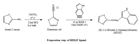 Yareeb J. Sahar's et, al., focused on the development and characterization of a novel azo dye 12 ligand, (HIDAT), produced by reacting indole with the 12-diazonium ion of 2-aminothiazole. Utilizing a variety of methods, such as elemental analysis (C.H.N.S.), mass spectrometry, ~1H NMR, FT-IR, UV-visible spectroscopy, magnetic susceptibility, and 12molar conductivity, the HIDAT ligand and its transition metal 12complexes with cobalt, copper, and nickel and palladium were successfully synthesized and defined. The palladium (II) complex was created in a 1:1 ratio, but the other complexes were synthesized in a 1:2 metal-to-ligand ratio. Spectroscopic data indicated that HIDAT operates as a bidentate ligand, implying octahedral geometry for all metal complexes except the palladium complex, which has a square planar structure. HIDAT also demonstrated pH sensitivity in aqueous solutions. Cytotoxicity experiments revealed that the palladium complex was much more harmful to human leukemia HL-60 cells than to normal HdFn cells. Furthermore, molecular docking (MOE) investigations revealed that the palladium complex had a considerable inhibitory effect on the leukemia cancer target protein (3s7s), confirming its potential as an anticancer treatment(33).