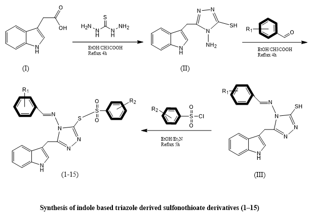 Shoaib Khan et, al., created and A novel series of sulfonothioate derivatives containing both indole and triazole moieties (compounds 1–15) was synthesized with the goal of identifying potential antidiabetic agents. The chemical structures of the synthesized compounds were thoroughly characterized using advanced analytical techniques, including proton (^1H) and carbon (^13C) nuclear magnetic resonance (NMR) spectroscopy, as well as high-resolution electron ionization mass spectrometry (HREI-MS). The antidiabetic potential of these compounds was evaluated in vitro, with their inhibitory effects compared against the standard reference drug, Acarbose. Among the tested derivatives, compounds 7, 9, and 15 demonstrated superior inhibitory activity, recording lower IC?? values than Acarbose. Specifically, compound 7 exhibited IC?? values of 3.20 ± 0.10 µM and 4.20 ± 0.50 µM; compound 9 showed values of 5.10 ± 0.10 µM and 5.70 ± 0.30 µM; and compound 15 displayed IC?? values of 3.20 ± 0.70 µM and 3.40 ± 0.50 µM, suggesting stronger potency. Structure–activity relationship (SAR) analysis highlighted that both the nature and position of substituents—such as fluorine, chlorine, hydroxyl, and nitro groups—played a pivotal role in modulating biological activity. Additionally, molecular docking simulations demonstrated favorable binding interactions between the most active compounds and their target enzymes, further validating their potential as enzyme inhibitors. Pharmacokinetic profiling through ADME (absorption, distribution, metabolism, and excretion) studies indicated that these lead compounds possessed drug-like properties aligning with accepted pharmaceutical benchmarks, supporting their suitability for further development as antidiabetic therapeutics(17).