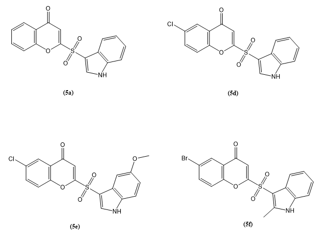 Anjela Xalxo et, al., created a novel 3-sulfenylindole derivatives was synthesized through an oxidative cross-dehydrogenative coupling reaction involving 4-hydroxy-2H-chromene-2-thione and indole. This transformation was achieved under mild and environmentally considerate reaction conditions, utilizing 10 mol% molecular iodine as the catalyst and tert-butyl hydroperoxide (TBHP) as the oxidant in dimethyl sulfoxide (DMSO) at ambient temperature. The method demonstrated high efficiency and aligns with green chemistry principles, making it a sustainable approach for constructing biologically relevant scaffolds. Given their favorable physicochemical profiles and potential pharmaceutical relevance, selected members of this compound series—namely 3a, 3b, 3d, 3f, 3h, and 3k—underwent further oxidative modification to yield their corresponding sulfone derivatives. These structural transformations not only expand the chemical diversity of the synthesized library but also contribute to exploring their potential as future drug candidates by enhancing their metabolic stability and bioactivity. Molecular docking and target prediction studies were performed on six sulfone derivatives (5a-5f), four of which (5a, 5d, 5e, and 5f) demonstrated significant binding affinity and were chosen for in vitro evaluation. These sulfones showed strong anti-proliferative activity against MCF7 breast cancer cells. Additionally, quantum chemistry research found that the reaction is exergonic, supporting its thermodynamic viability. Overall, this study describes a flexible and sustainable approach for producing physiologically active sulfenylindole sulfones with potential anticancer uses(21).