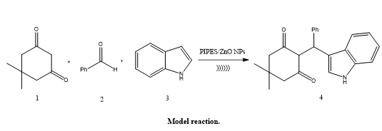 Suchita S. Gadekar described the Zinc oxide nanoparticles (ZnO NPs) and 1,4-piperazine diethanesulfonic acid (PIPES) were synthesized, characterized, and used catalytically as a dual catalytic system by Suchita S. Gadekar. Under ultrasonic irradiation at 60°C, this catalyst effectively promoted the reaction of dimedone, benzaldehyde, and indole to generate 2-((1H-indol-3-yl)(phenyl)methyl)-5,5-dimethylcyclohexane-1,3-dione. The catalytic performance was greatly improved by the combination of PIPES's Brønsted acidity and ZnO NPs' surface-active characteristics. The produced molecule also has medicinal relevance, which emphasizes the benefits of this green synthesis method with ultrasonic assistance.(34).
