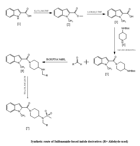 Khushbu Agrawal et, al., highlighted the growing significance of indole and its derivatives in a range of biological activities and emphasized its value in medicinal chemistry. Antitubercular, antiviral, antibacterial, and antimalarial, anti-inflammatory in nature antileishmanial, anticholinesterase, anticancer, and enzyme inhibitory qualities are a few these comprise. The WHO has identified antimicrobial resistance (AMR) as one of the top ten global health threats due to its increasing prevalence. New therapeutic medications are desperately needed. In this study, we created novel indole derivatives based on sulphonamides from 1H-indole-2-carboxylic acid. 1H NMR and LC-MS spectroscopy were used to validate the structural identity of the produced compounds. Both Gram-positive and Gram-negative bacterial strains were used to assess the antibacterial activity of these compounds. Among the investigated substances, good activity was demonstrated against Staphylococcus aureus, with particularly high inhibitory effects against Klebsiella pneumoniae, showing potential as effective antibacterial agents(8).