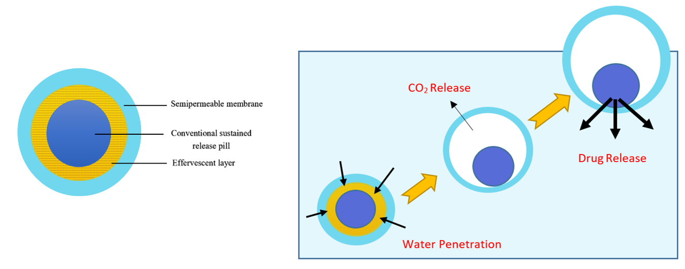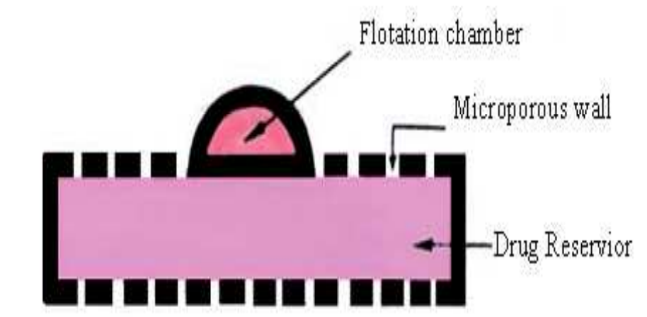 These systems contain a drug reservoir enclosed in a floating chamber. The outer layer contains pores that allow gastric fluid to enter and dissolve the drug, but the internal air compartment ensures buoyancy [22, 30].