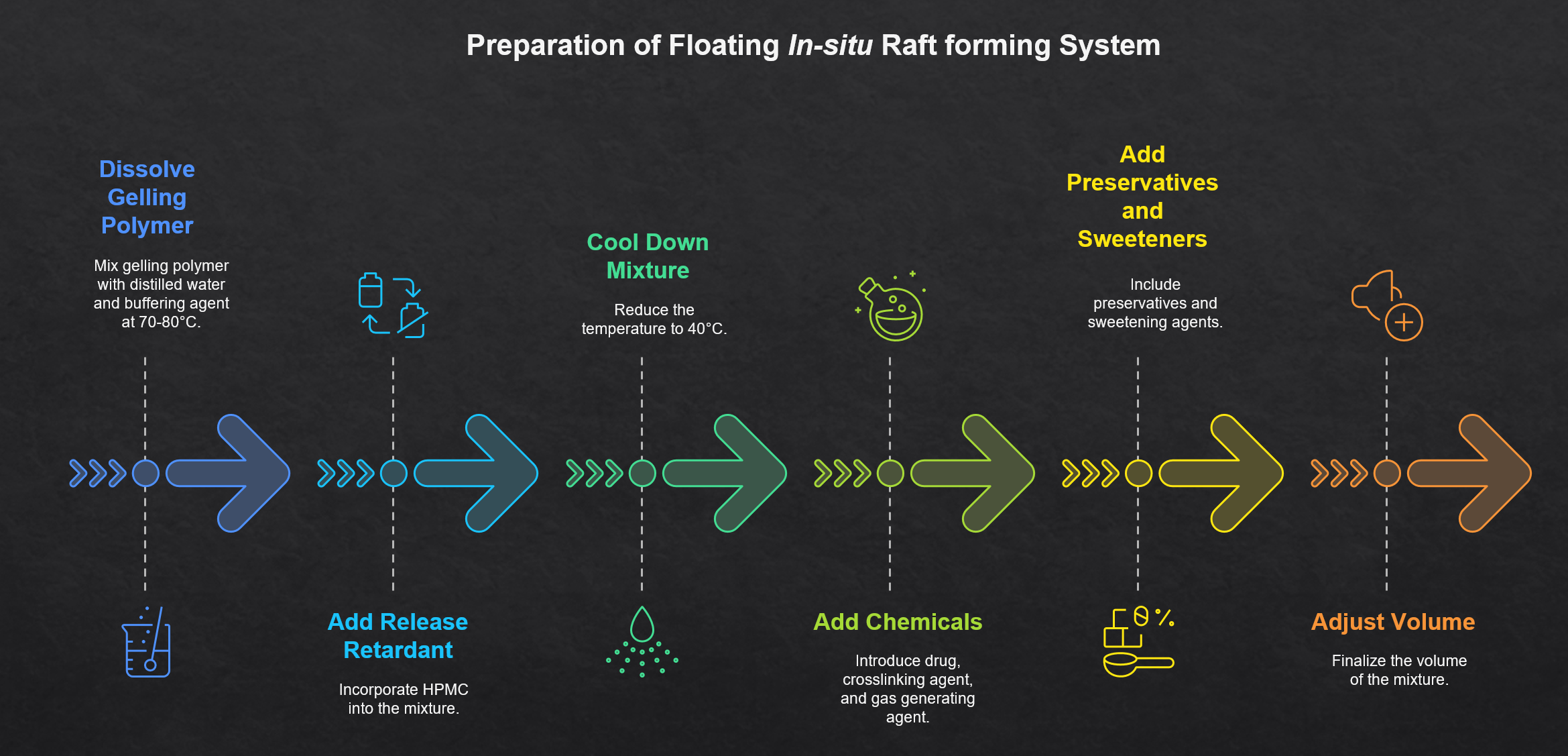 Gastroprotective drug delivery systems (GRDDS) have emerged as a promising approach to enhance the bioavailability and therapeutic efficacy of drugs with narrow absorption windows, low solubility at high pH, or local activity in the stomach. Among various GRDDS technologies, the floating in-situ raft system represents a novel and innovative strategy designed to prolong gastric residence time and enable sustained drug release. This system involves a sol-to-gel transition triggered by gastric conditions, forming a buoyant raft-like structure that floats on the gastric fluid. The formulation typically comprises a gelling agent (such as sodium alginate), a gas-generating agent (like calcium carbonate or sodium bicarbonate), and a cross-linking agent that reacts under acidic pH. The formed gel entraps the drug and slowly releases it in a controlled manner, enhancing patient compliance and improving therapeutic outcomes. This review explores the design principles, formulation components, mechanisms, advantages, and recent advancements in floating in-situ raft systems, highlighting their potential in treating gastrointestinal disorders and improving the pharmacokinetic profiles of various drugs.