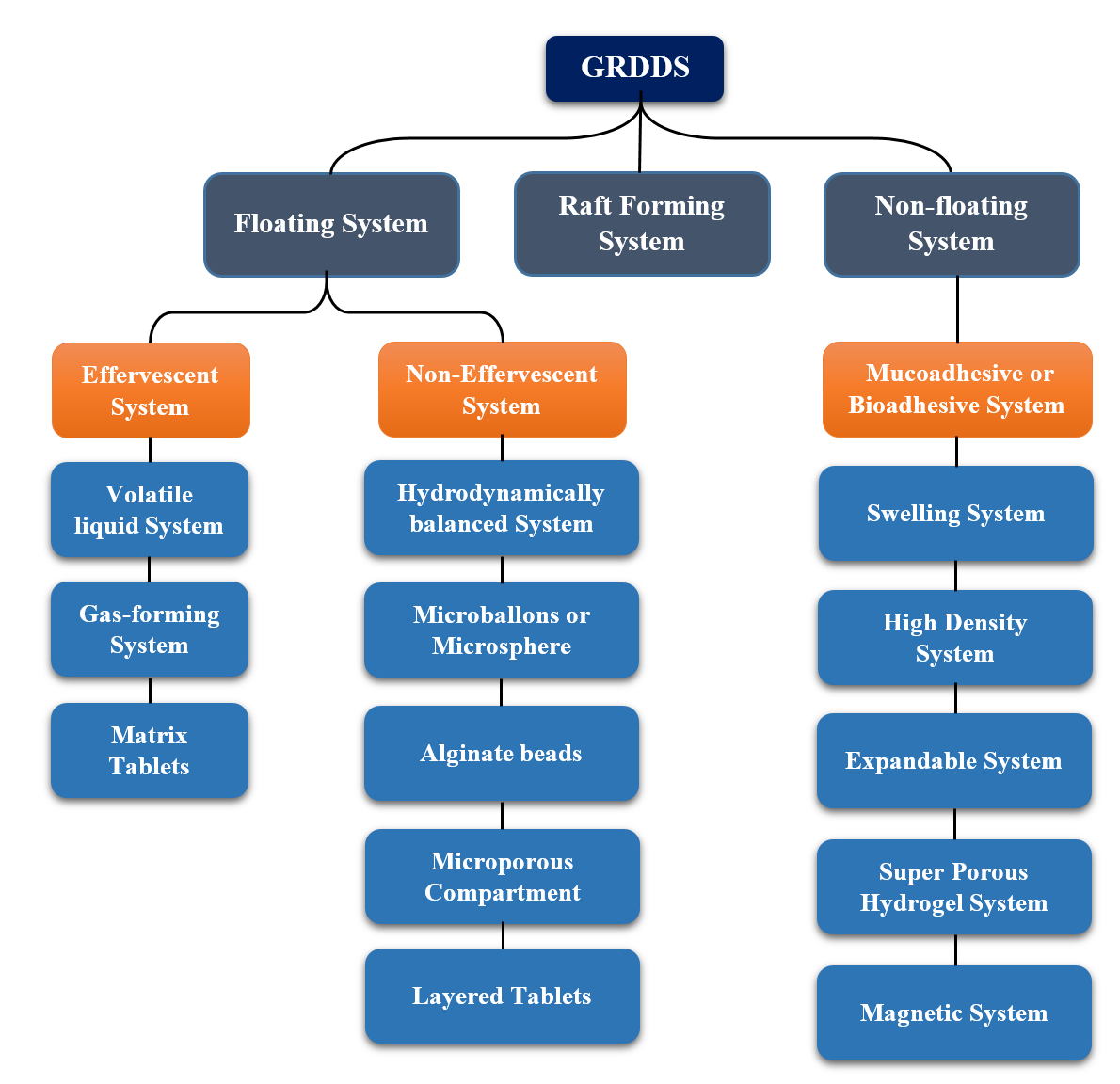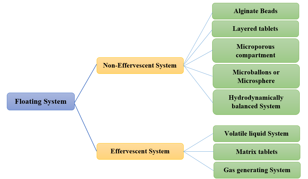 In 1968 Davis initially reported floating systems, which have a lower bulk density than the stomach content. Low density systems are the most commonly used gastroretentive dosage forms which is also known as floating drug delivery systems [21, 22]. Low-density systems exhibit lower density or higher buoyancy than the gastric content (1.004 g/cm3) which facilitates floating of the drug delivery systems. An increased gastric retention time helps to release the drug in a sustained or controlled manner at a desired rate for a long period of time depending on its buoyancy property. According to this buoyancy mechanism this low-density system can be divided into effervescent and non-effervescent systems [23, 24].