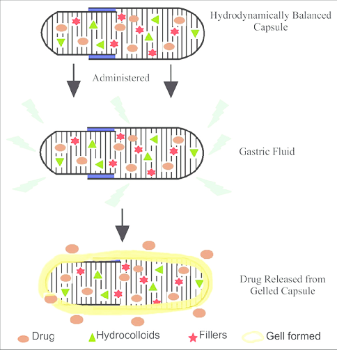 These are formulations composed of gel-forming polymers such as hydroxyl propyl methylcellulose (HPMC). On contact with gastric fluid, the polymer hydrates and swells, forming a gelatinous barrier that keeps the dosage form buoyant. Example: HBS tablets containing drug dispersed in a gel-forming matrix [30].