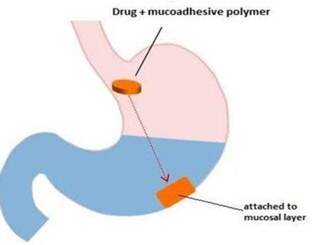 This delivery system can enhance the absorption of drugs in a specific site of action by adhering to the mucosal layers present in the region. In this drug, delivery system mucoadhesive polymers are employed which can stick to the epithelial lining present in the stomach wall as shown in Fig. 9. Thus, localization of dosage form occurs which enhances the gastric residence time [32, 33]. There are different mechanisms by which this dosage form can adhere to the mucosal surface i.e., wettability, diffusion, adsorption, electronic and fracture theories. There are various bioadhesive polymers for preparing bioadhesive drug delivery such as chitosan, tragacanth, dextrin, alginates, Hydroxypropyl methylcellulose, cholestyramine, polylactic acid, polyethylene glycol etc. Mucoadhesive polymers may interact with mucin by electrostatic interaction, hydrogen bonding, hydrophobic bonding and disulphide bond formation.