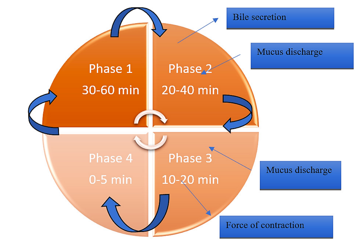 Phase III: It is for short period of intense, large regular contraction from 10 to 20 min, and it sweeps the undigested material from the stomach to the small intestine. Phase III is termed as ‘housekeeper wave’ as it enables to sweep away all undigested materials out of the stomach & down to the small intestine. Between phase III & phase I of two consecutive cycles a brief transitional phase IV occurs.
