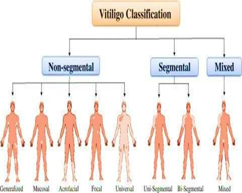Vitiligo is a prevalent, chronic autoimmune disorder of the skin characterized by the loss or malfunction of melanocytes—the cells responsible for producing pigment in the skin, hair, and mucous membranes. Affecting approximately 0.5–2% of the global population, the disease manifests as distinct white or hypopigmented macules, sometimes accompanied by leukotrichi[1]. It can emerge at any age and affect individuals of all ethnicities, sexes, and skin tones, with common early lesions appearing on areas such as the fingertips, knuckles, lips, eyelids, toes, and genital regions. According to the 2011 consensus, vitiligo is clinically divided into two major types: nonsegmental vitiligo (NSV) and segmental vitiligo (SV) [2]. NSV typically shows symmetrical patterns and encompasses generalized, universal, acrofacial, mucosal, and mixed subtypes. SV, on the other hand, usually presents as asymmetrical patches that follow specific dermatomal distributions, commonly arise in childhood or early adulthood, and tend to stabilize after one to two years of progression [3].