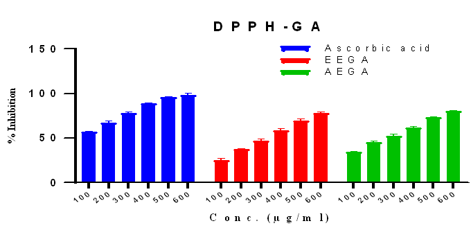 Free radical scavenging by DPPH scavenging method: Free radical scavenging activity of samples was measured using the 2,2-diphenyl-1-picrylhydrazyl (DPPH). Briefly, 1.0 ml of sample solution with different concentrations (0.1, 0.2, 0.3, 0.4, 0.5 and 0.6 mg/ml) was added to a 4 ml of 0.004% methanolic solution of DPPH.
