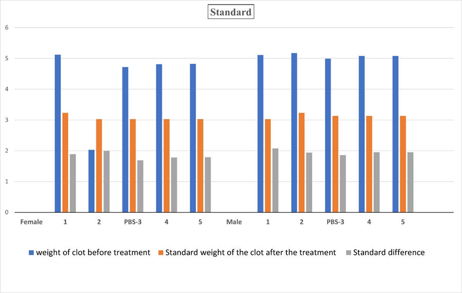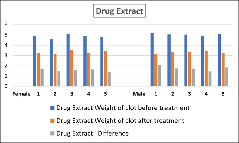 The extract of Lens culinaris shows good activity in the male and female blood samples. The weight of the clot decreased more in the male blood sample than in the female. This shows that the extract has better activity in male blood samples than in female blood samples. The difference in clot weight in standard (Streptokinase) treatment is significantly better.