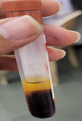 Figure No. 4 - Blood sample showing plasma (yellow layer) and red blood cell fraction after sedimentation /centrifugation