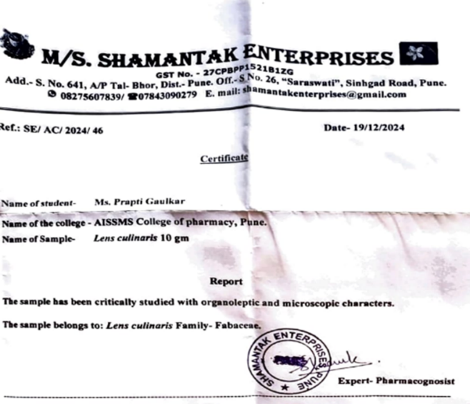 Figure No. 2. Certificate of Lens culinaris drug extract