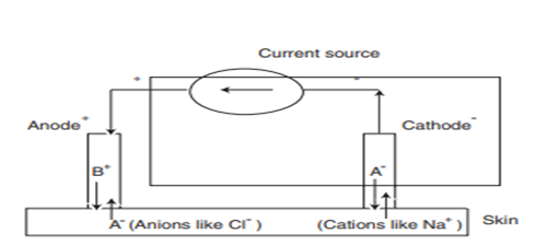The reservoirs may only contain saline or buffer when using reverse iontophoresis for clinical monitoring. The current source drives electronic current to the active reservoir, where it is converted into ionic current, when the active and indifferent reservoir systems are applied to the skin. Ionic current travels via the active reservoir, the skin, the indifferent reservoir underneath the skin, and back through the skin into the indifferent reservoir. It is converted back into electronic current at the indifferent reservoir, finishing the circuit at the current source's opposite pole. An electrode with a defined charge repels a substance that is attracted to an oppositely charged electrode that is positioned elsewhere on the body. Therefore, a positively charged medication or ion in solution, an electronic device to control the current, an anode reservoir system (with the anode electrode), and a cathode reservoir system (with the cathode electrode) make up an anodal iontophoretic device. The cathode is applied to a different area of the skin than the positively charged medication, which is placed in the anode reservoir system at the intended application site. All cations, including the positively charged medication, migrate into the skin and away from the anode when an electric current is applied. In parallel, the body's negatively charged ions flow from the body into the donor reservoir [17]. An anodal iontophoretic system is shown in Fig 2
