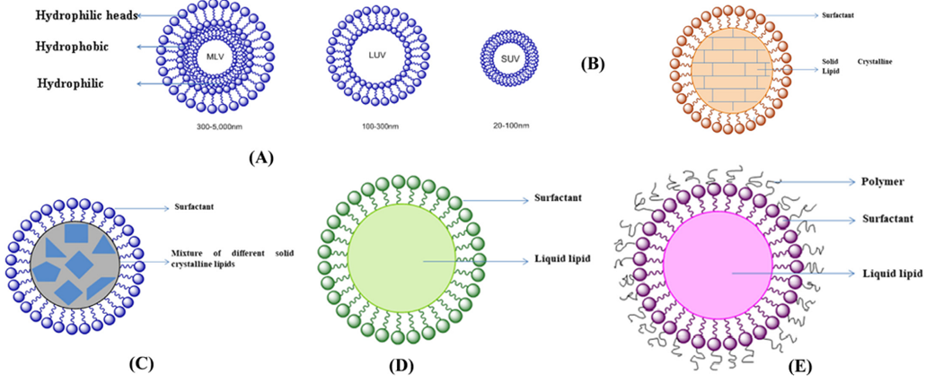 Figure 1 Schematic presentation of (A) Liposomes; (B) Solid lipid nanoparticles; (C) Nano lipid carriers; (D) Nanoemulsion; (E) Nanocapsules.