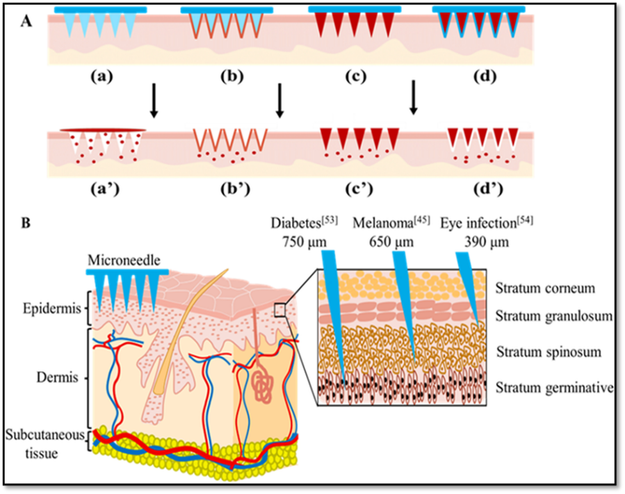 Figure 7: (A) Schematic diagram of different types of microneedles for gene-drug delivery. (a)-(d): Microneedles are inserted into the skin. (a): Solid microneedles. (b): Coated microneedles. (c): Soluble microneedles. (d): Hollow microneedles. (a’)-(d’): Sustained gene-drug release after microneedles application. (a’): Solid microneedles. (b’): Coated microneedles. (c’): Soluble microneedles. (d’): Hollow microneedles. (B) Skin structure diagram and transdermal treatment of microneedle.
