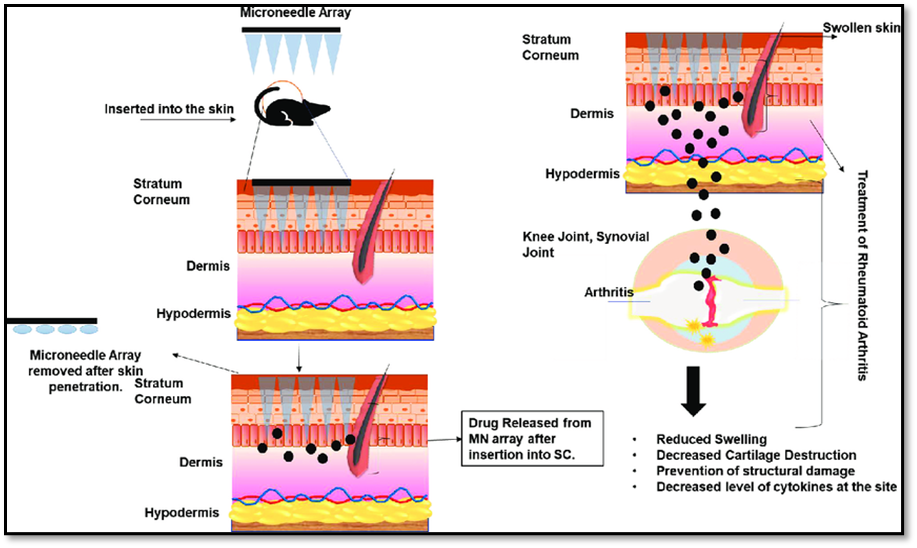 A collection of physicochemical technologies known as "drug delivery systems" (TDDS) are capable of controlling the release and distribution of pharmacologically active substances into cells, tissues, and organs in order to maximize their effectiveness [1]. With a surface area of 20 square feet and essential functions, the human skin is the largest organ in the body [2]. It serves as a barrier between the internal and external environments, keeping harmful substances out of the body, shielding it from infections and the elements, controlling body temperature, minimizing water loss, and permitting touch, heat, and cold sensations [3]. TDDS is a painless systemic drug delivery technique that applies a medication formulation to healthy, intact skin. Microneedles have been used extensively to improve the transdermal delivery of drug molecules, particularly as a pre-treatment where the drug can diffuse through remaining skin holes from a topical formulation [4].