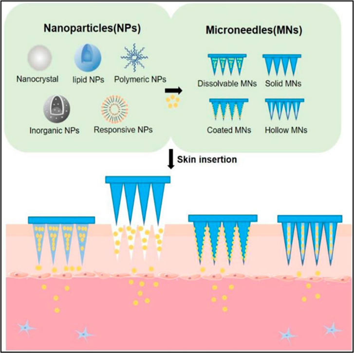 The pharmaceutical industry is currently very interested in MN arrays because of their many benefits over more conventional drug delivery techniques like parenteral and oral administration. The ability to deliver the active pharmaceutical ingredient painlessly, avoid hepatic first-pass metabolism, and expand the variety of drugs that can be administered intradermally and transdermally are a few advantages [9]. Recently, some review papers have reported on MNs; this work focused on this topic differently, including the design and summary of drug-carrying nanoparticles integrated with MNs. In this review, we first present the four different kinds of drug-carrying nanoparticles: inorganic, polymeric, lipid, and nanocrystal nanoparticles. Next, we discuss MN-based approaches that have been used to facilitate the transdermal delivery of these nanoparticles for drug delivery. Lastly, we offer our thoughts on the possible application of MNs-mediated skin nanoparticle delivery [10, 11, 12].