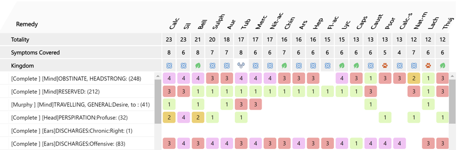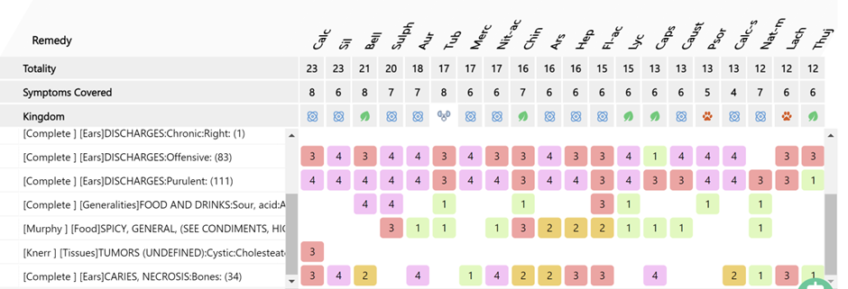 The case was repertorized (cross repertorization )using Zomeo Elite homoeopathic software, and the repertorisation chart yielded Calcarea carbonica, Silicea, Belladonna, Sulphur, Aurum metallicum, and Tuberculinum as the top remedies. Also verified in the Synthesis repertory, Tuberculinum emerged as the only remedy listed under the rubric EAR – Discharges, chronic – right. On the basis of repertorial analysis, consultation of Materia Medica, and the patient’s constitutional profile, Tuberculinum was selected as the first prescription. The drug is well known for its affinity toward recurrent suppurative conditions, chronic destructive processes, restlessness, obstinate temperament, and tubercular predisposition, making it the most suitable constitutional remedy for this case.