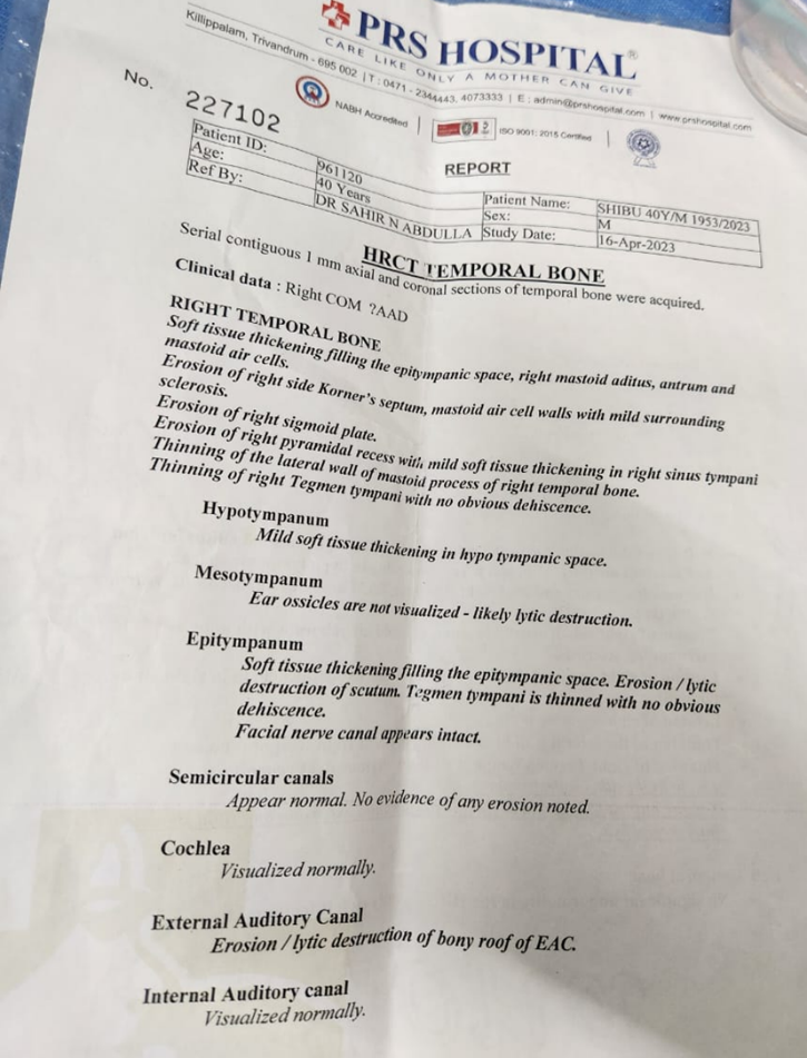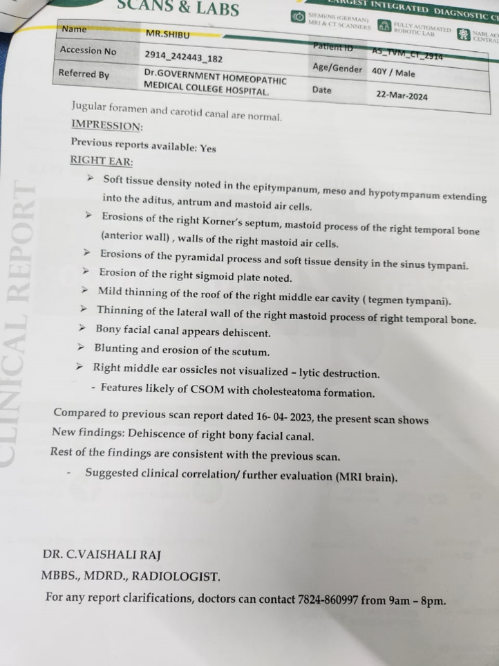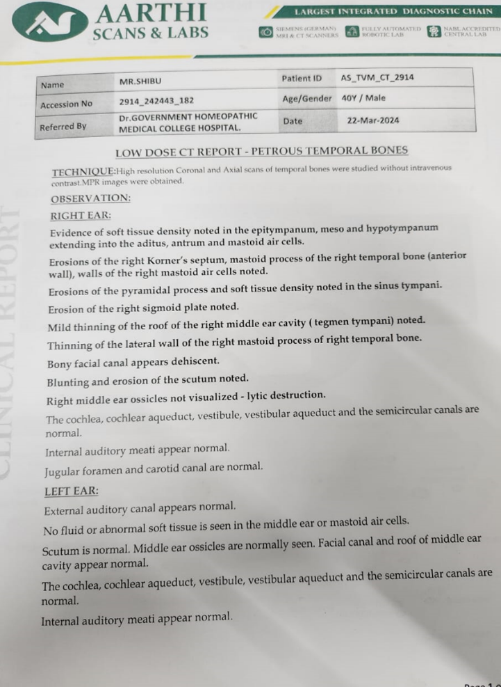 A 40-year-old male presented to the OPD of Government Homoeopathic Medical College , Thiruvananthapuram on 07-10-2023 with a one-year history of persistent right-sided otorrhoea. The discharge was purulent, foul-smelling, and occurred 5–6 times daily, with a progressive increase over the last four months. The profuse discharge caused marked discomfort, often wetting the pillow and preventing him from lying on the right side. The patient was apparently healthy prior to the onset of symptoms. Initially, he experienced offensive discharge 3–4 times per day and received allopathic treatment without relief. A high-resolution CT scan of the temporal bone confirmed the diagnosis of right-sided cholesteatoma, for which surgical intervention was advised. Seeking alternative management, he underwent Ayurvedic treatment but experienced no improvement, following which he visited the homoeopathic OPD for further evaluation. He has a history of recurrent allergic rhinitis, and the family history revealed tuberculosis in his father.