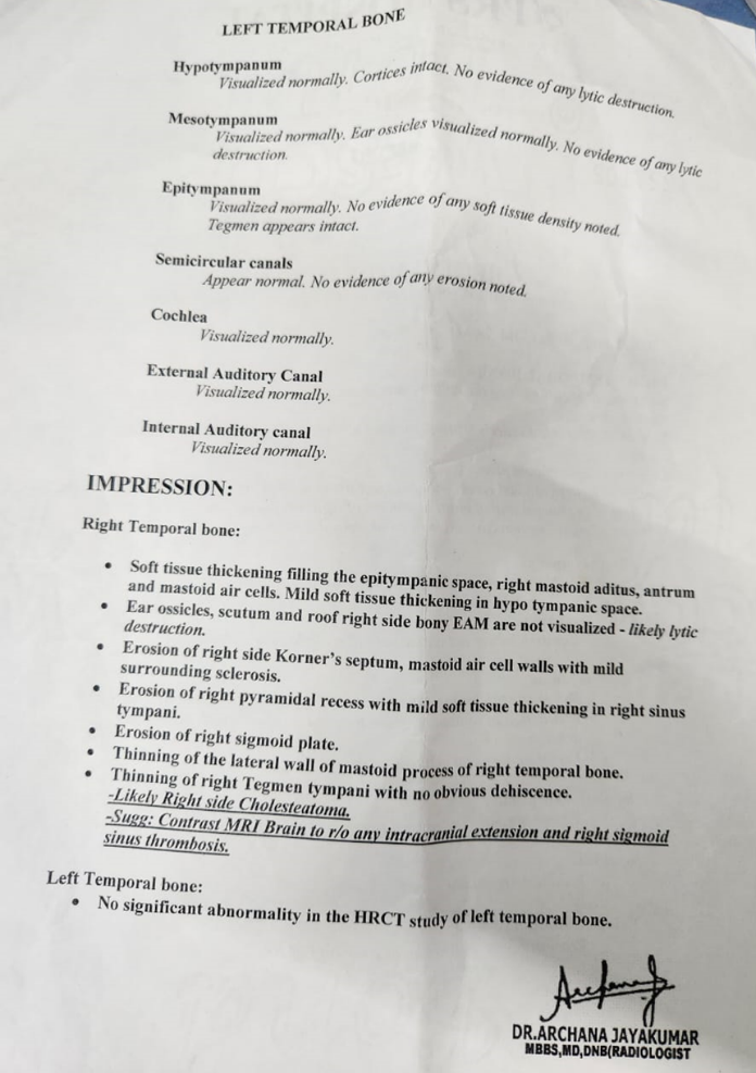On physical evaluation, he had profuse perspiration over the scalp, moderate appetite and thirst, and regular bowel habits. Due to continuous discharge from the right ear, he preferred sleeping on the left side to avoid discomfort. Local examination revealed purulent, offensive discharge from the right ear, and otoscopy showed debris within the external auditory canal. HRCT findings confirmed bony involvement, supporting the diagnosis of cholesteatoma.