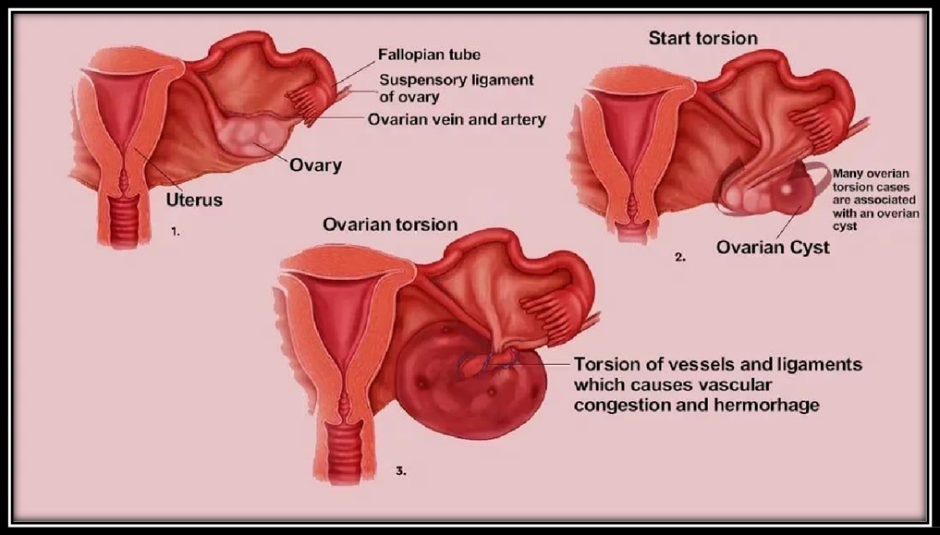 Females of all ages can experience ovarian torsion, which is a gynecological emergency. It describes ischemia alterations in the ovary caused by a full or partial rotation of the adnexal supporting organ. The ovary and fallopian tube are more frequently involved in torsions, while isolated torsion involving just one of them occurs less frequently (one in 1.5 million women). There have also been reports of torsion involving paratubal or paraovarian cysts. In order to safeguard ovarian and tubal function and avoid serious morbidity, early diagnosis and surgery are crucial.