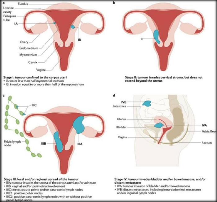 Fig 3. A tumor that is limited to the corpus uteri (Stage I; panel a), invades the cervical stroma but remains confined to the uterus (Stage II; panel b), spreads locally and/or regionally (Stage III; panel c), and invades the bladder and/or bowel mucosa and/or distant metastases (Stage IV; panel d) are the four stages that make up this staging system.