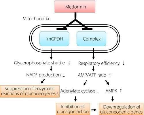 The glucose-lowering effect of metformin is mediated through multiple mechanisms that act synergistically. The primary action of metformin is the inhibition of hepatic gluconeogenesis, which leads to reduced endogenous glucose production. This effect is largely attributed to the inhibition of mitochondrial respiratory chain complex I, resulting in decreased ATP production and increased intracellular AMP levels. Elevated AMP activates adenosine monophosphate-activated protein kinase (AMPK), a key regulatory enzyme involved in cellular energy homeostasis.
