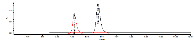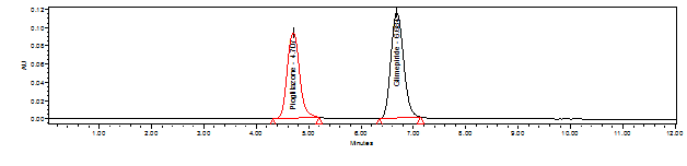 Observation: Pioglitazone and Glimepiride were eluted at 4.713 min and 6.691 min respectively with good resolution. Plate count and tailing factor was very satisfactory, so this method was optimized and to be validated.