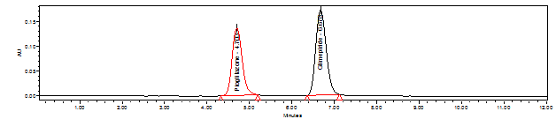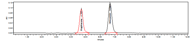 Retention time : 2.902 min for Pioglitazone and 3.618 min for Glimepiride.