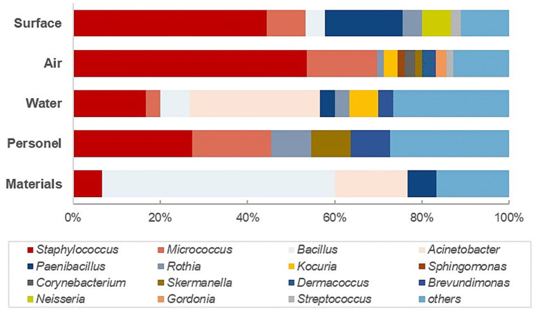 As demonstrated, the most significant proportion of genus-level contamination was associated with Staphylococcus spp. (40.25%), Micrococcus spp. (11.20%), Bacillus spp. (8.30%), Actinobacteria (5.81%), and Paenibacillus spp. (4.56%), the top 5 genera contributing to 70% of all the isolates. The 19 predominant species accounted for 64% of all 94 species isolated, with a distinct predominance of Staphylococcus spp., which occupied 9 of the 19 species that comprise most of the microflora, of which S. cohnii, S. epidermidis, and S. hominis were detected more than 10 times. Micrococcus luteus, was also shown to be a frequently occurring contaminant. The investigation plan further categorized the monitoring objectives into airborne contamination (using settle plates and volumetric air sampling) and surface contamination (via contact plates and swabs) to enable more targeted analysis. As shown in Figure 5, airborne flora exhibited the greatest diversity in both quantity and species, encompassing 26 different genera. The most frequently recovered organisms were Staphylococcus spp. (69%) and Micrococcus spp. (74%). Among the predominant genera listed in Table 7 (defined as those with ≥ three isolations), four were exclusively detected through airborne sampling. Interestingly, no spore-forming Bacillus species were identified in the air samples—an unexpected finding that contrasts with the common assumption that such spores are primarily transmitted through air. This discrepancy may be attributed to the selection of sampling locations or protocols. Similarly, the high prevalence of Gram-positive cocci detected in the water system could indicate suboptimal sampling practices. These observations highlight key areas for improvement in the design and implementation of future environmental monitoring protocols.In contrast, 58% of the spore-forming bacterial isolates were traced to raw materials, and 32% to environmental surfaces, underscoring the critical role of raw material quality control and proper disinfection procedures during material transfer.