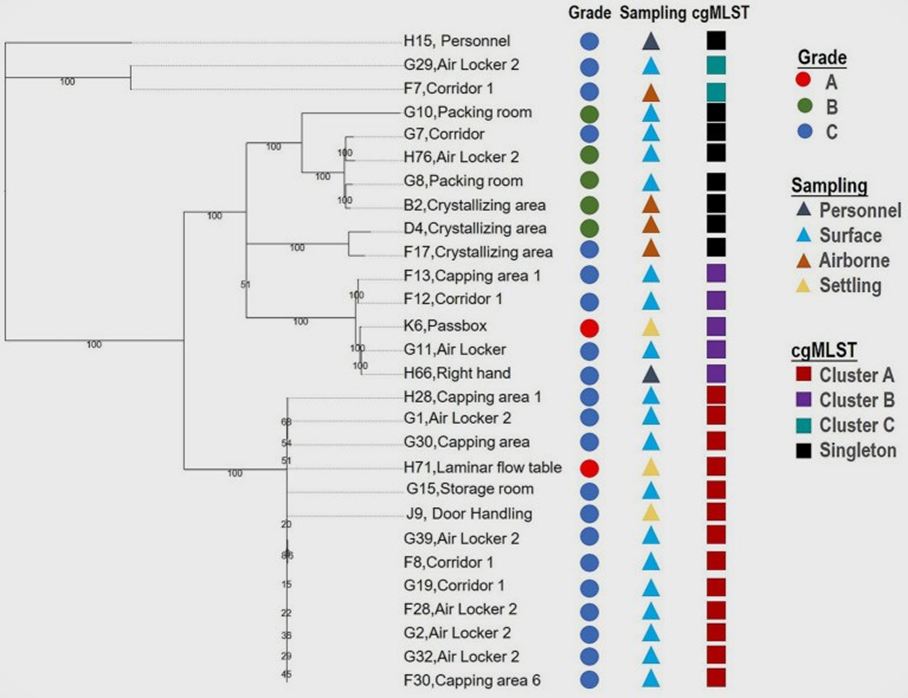 From June to August 2022, the environmental monitoring program was carried out in a sterile powder for injection drug manufacturing facility in ASPIRO INJECTABLE HYDRABAD. Samples were taken from its two primary production areas: formulation manufacture (MF) and substance manufacture (MS), both areas maintained the 4 grades of clean rooms. Samples were taken from multiple elements of the production process including finished products, raw materials, personnel, production environment, and water. Different pharmacopeial techniques were used: (a) active air sampling using a volumetric air sampler; (b) passive air sampling using settle plates; (c) swabs for irregular surface sampling; (d) contact plates for flat surfaces; (e) 100 mL membrane filtration onto Reasoner’s 2A Agar medium (R2A, bioMérieux, France) for water for injection. Trypticase Soy Agar medium (TSA, bioMérieux, France) was used for the sampling except for the water samples, and a neutralizer to neutralize the effects of disinfectant residues on surfaces was added when necessary. An intensive sampling strategy was implemented, and the sampling frequencies were set according to the potential microbiological contamination risk assessed for different monitoring items and scopes. In general, settle plates were exposed for the duration of operations and changed after 4 h for grades A and B; active air sampling was conducted for each shift. Both settle plates and active air samples were taken for the grade C area for each batch. For hard surfaces like the product contact area, filling machine, and relevant components, sampling was conducted every shift for grades A and B, and each week for grade C. The collected plates were under 30°C–35°C aerobic incubation for 3–5 days for bacterial growth [24,25,26]