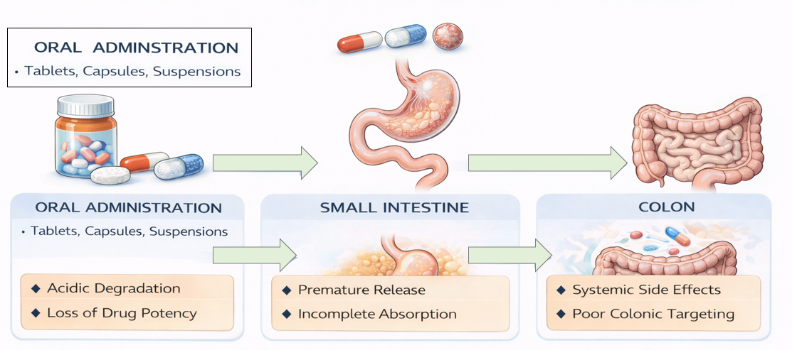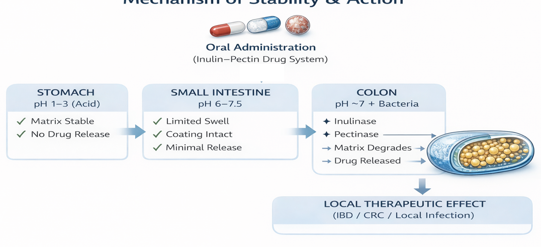 Traditional drug delivery systems, such as conventional tablets, capsules, and oral suspensions, face multiple limitations that reduce therapeutic efficacy and patient outcomes. As illustrated in Figure 1, these limitations include poor site-specific targeting, premature drug degradation in the gastrointestinal tract, fluctuating plasma drug levels, low bioavailability, and systemic side effects. Such constraints underscore the need for advanced colon-targeted delivery platforms, like microbiota-activated inulin–pectin systems, which offer controlled, localized drug release and improved therapeutic precision. Among these systems, inulin and pectin are particularly valuable due to their resistance to digestion in the upper gastrointestinal tract and selective degradation by colonic microbiota [3,24]. Engineering inulin–pectin systems enable precision colon therapeutics for colorectal cancer, inflammatory bowel disease (IBD), and local infections by combining microbial responsiveness, swelling behavior, and tunable polymer architecture [10,20,22]. Plant-derived polysaccharides, such as inulin and pectin, have gained significant attention as microbiota-responsive carriers for colon-specific drug delivery. Inulin, a fructan-type polysaccharide, resists digestion in the stomach and small intestine but undergoes selective fermentation by colonic bacteria, enabling enzyme-triggered drug release [1,7,17] Similarly, pectin, composed primarily of galacturonic acid residues, exhibits gel-forming capacity and susceptibility to pectinolytic enzymes present in the colon, supporting controlled and localized drug release [8,25]. Their biodegradability, biocompatibility, and prebiotic nature make them ideal candidates for designing smart delivery platforms [5,14,24]. To enhance stability and modulate release kinetics, inulin and pectin are frequently combined with other polymers or formulated into microspheres, hydrogels, pellets, and film-coated systems tailored for colon targeting [4,9,16,28]. Beyond serving as carriers, these polysaccharides also contribute to gut microbiota modulation and short-chain fatty acid production, offering additional therapeutic benefits in inflammatory bowel disease and colorectal cancer management [6,20]. Thus, microbiota-triggered inulin–pectin systems represent a promising and sustainable approach for precision colon-targeted drug delivery.