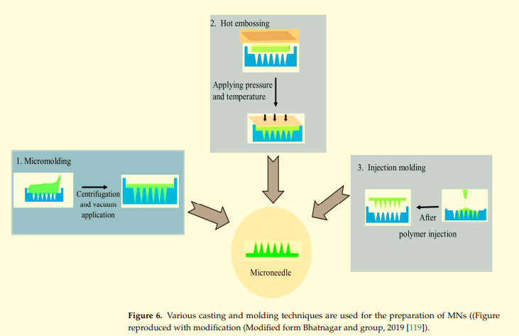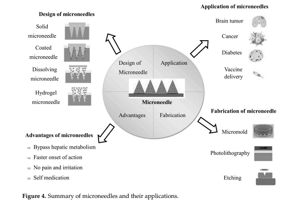 MNs are medical devices that deliver medication elements of the skin's outermost layers using one or a collection of needles with a diameter of a few micrometres [31, 32]. A needle up to 1000 µm long is sufficient for transdermal drug delivery since it can penetrate the corneum layer and discharge the medication within the dermis [33, 34]. MNs gain from lowering stress or fear brought on by vasovagal reactions, Fear of needles, and suffering while using a conventional a needle [35, 36]. MNs are produced of variety of materials, such as glass, metal, & silicon. The forms of the needles may vary from square pyramids to cones, depending on the manufacturing process [37]. MNs must have sufficient strength to puncture the skin without causing haemorrhage [38]. The MNs should ideally break down in the human skin to liberate the confined pharmacological cargo and avoid sharp waste [39]. MNs are superior to oral and other drug administration modalities because of their special qualities and Steer clear of sharps and dangerous waste [40,41]. This technique would be useful for swallowing difficulties in children and elderly people [40]. A variety of MNs can be categorised based on the intended drug delivery method, including metal MNs, coated MNs, sugar MNs, hollow MNs, solid MNs, dissolving MNs, polymer MNs, glass MNs, hydrogel forming MNs, ceramic MNs, and silicon MNs [42–49]. The majority of MNs were constructed of silicon in the early stages of development [50]. Certain metals, including as nickel, stainless steel, titanium, and other materials, offer well-integrated The mechanical properties, like high durability and strength, that can shield protection of MNs from mechanical failure. Moreover, the cost of producing metal MNs is less than that of silicon MNs. Bio hazardous tip debris will also be produced by metal MNs [51]. Polymers are the most promising materials for production in Minnesota. They can have advanced characteristics, including integrated controlled release mechanisms, and be versatile, affordable, readily available, and biocompatible [48]. Because polymers are more resilient than brittle materials like silicon, polymer MNs can avoid brittle fracture when they are inserted into the skin. Since most polymers don't have serious negative effects, polymer MNs rarely are compatible with the body. Please take aware that a Micromolding is one of the manufacturing techniques appropriate for producing MNs in large quantities at a moderate cost. Due to the low melting temperature of the majority of polymers. Polymers are therefore becoming more and more well-liked and are thought to be promising materials for MN manufacture [51]. Over the previous forty years, Minnesota technology has continuously improved. MNs have been shown to carry several preclinical studies and a limited number of clinical trials involving the administration of vaccinations, insulin, and other pharmacological dosage forms through the skin [52].