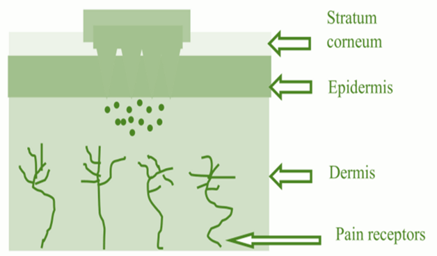 Transdermal patch needs the medication to pass through the stratum corneum barrier, its bioavailability is reduced. By adding the transdermal patch can act as a permeability enhancer by somewhat increase drug penetration. The dermis is deeply penetrated by the hypodermic needle, which contains pain receptors. Because it hurts, patients are less likely to comply, even though it can deliver 90–100% of the loaded medicine. MNs release 100% of the loaded medicine painlessly by avoiding the stratum corneum barrier and entering the dermal and epidermal layers directly.